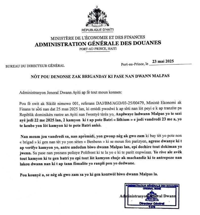 Le poste douanier de Malpasse, à la frontière haïtiano-dominicaine, a été violemment attaqué le 23 mai 2025 par un groupe armé dirigé par un certain « Benbenn », en réaction à la saisie de camions transportant illégalement des batteries au lithium. Les assaillants ont brutalisé les douaniers, saccagé les bureaux, détruit les documents officiels et emporté plusieurs camions, y compris ceux déjà saisis.
