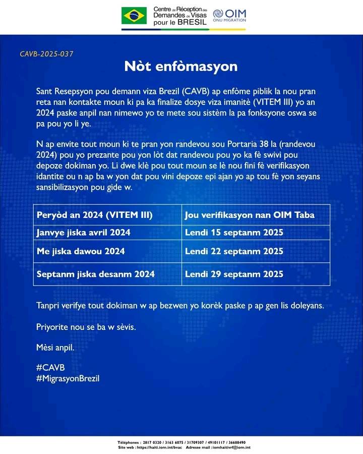 Le Centre de réception des demandes de visa brésilien (CAVB) informe le public que nous constatons des retards dans la prise de contact avec les personnes n’ayant pas pu finaliser leur dossier de visa humanitaire (VITEM III) en 2024, car de nombreux numéros saisis dans le système ne fonctionnent pas ou ne leur correspondent pas.